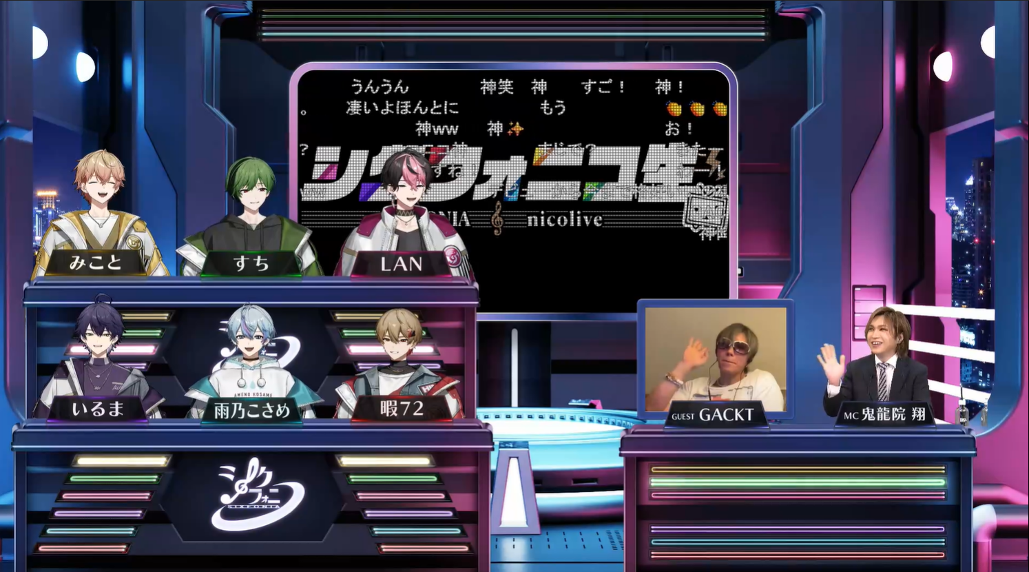 オープニングトークが終わり、シクフォニが「GACKTさ~~ん!」と呼ぶと、今回のスペシャルゲスト・GACKTがリモートで登場。今回が初対面のシクフォニとGACKT。早速鬼龍院が「シクフォニの印象はどうですか?」とGACKTに質問すると「みんなさ…なんか作りすぎなんじゃないの?」と話し、メンバーや視聴者の笑いを誘いました。