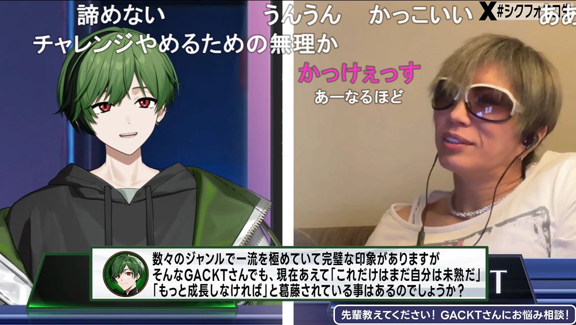 後半のニコニコプレミアム会員限定コーナーでは、「先輩教えてください!GACKTさんにお悩み相談!!!」を実施。シクフォニメンバー6人がそれぞれGACKTへ悩みを相談し、広い知見からズバッと回答してもらうコーナーでは「GACKTさんが思うカリスマとはどのような人でしょうか」(いるま)や「たまにジャンクなものを食べてしまうのですが、日々の食生活で特に気をつけていることはありますか?」(みこと)など、メンバーそれぞれGACKTに質問を投げかけ、愛と笑いにあふれるアドバイスを受けていました。