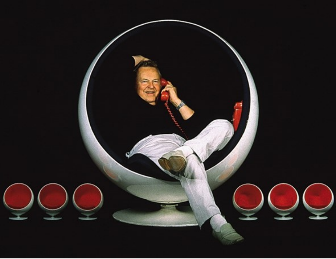 エーロ・アールニオ(1932-)は、家具デザインの分野で国際的に活躍する、フィンランドを代表するデザイナー。1960年代以降、繊維強化プラスチックなど新しい素材の探求に力を入れながら、曲線を主調とする斬新かつ遊び心のあるデザインを試みました。1963年にデザインされた《ボールチェア》は彼の代表作で、球体が宙に浮かぶような構造とポップな色彩を特徴としています。ユートピア的な近未来を予感させるこの椅子は、アメリカとソ連が宇宙開発を進めた1960年代において、宇宙旅行やSFに魅了された大衆の志向にも合致するものでした。