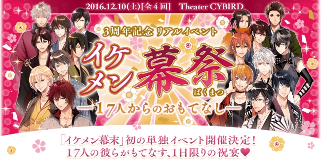 『イケメン幕末◆運命の恋』がサービス開始から3周年を迎えたことを記念し、タイトル初の単独リアルイベントを、12月10日(土)に、当社1階「Theatre CYBIRD」(代官山)にて、開催します。このイベント用のイケメンキャラクターの等身大パネルや特別展示、特別グッズの販売を予定しています。