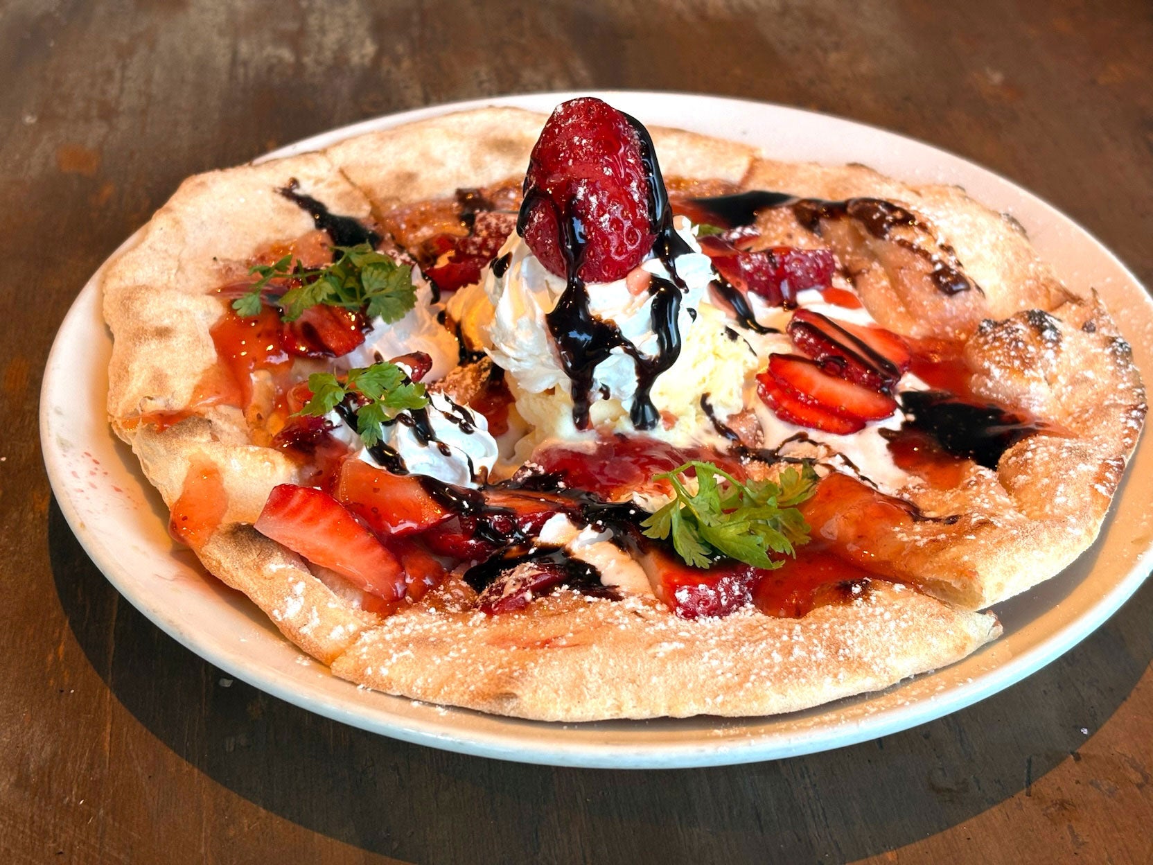 ピザの香ばしさと口の中でとろけるアイスの熱冷食感がクセになる、贅沢なデザートピザ。甘酸っぱい苺の酸味とバニラアイスの濃厚な甘み、ホイップクリームのふんわり食感を一度にお楽しみいただけます。