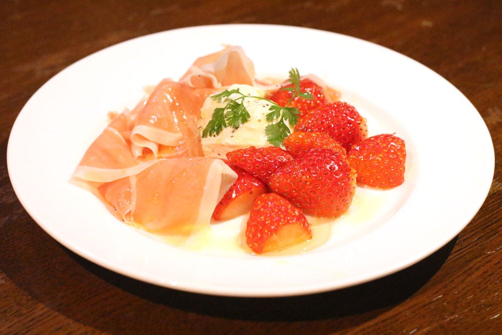 いちごの自然な甘みと生ハムの塩味を、マスカルポーネチーズのまろやかさが包み込み、絶妙にマッチさせた一品。白ワインと良く合い、前菜や軽食、デザートとしてもお楽しみいただけます。