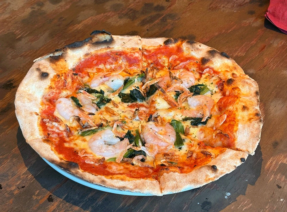 毎日店内で生地から手作りしている自家製窯焼きピザ。エビの甘みと旨み、菜の花のほろ苦さ、トマトソースの酸味とコクが絶妙にマッチした一枚。トッピングもご用意していますので、自分好みに仕上げることも可能です。