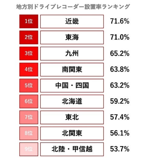 地方別でのドライブレコーダーの設置率ランキングで最も高かったのは「近畿」(71.6%)。次いで第2位が「東海」(71.0%)、第3位は「九州」(65.2%)となり、設置率が最も低かったのは「北陸・甲信越」(53.7%)という結果になりました。