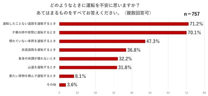 運転が不安になるシチュエーションは、「夕暮れ時や夜間に運転するとき」が70.1%という結果に。