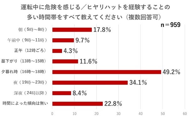 また、ヒヤリハットが発生する時間帯については、「夕暮れ時」(49.2%)、「夜間」(34.1%)と、ドライバーの約半数が夕暮れ時にヒヤリハットを経験しており、日が沈む前後、夕暮れ時の視界の悪さがヒヤリハットの発生につながっていると予想されます。
