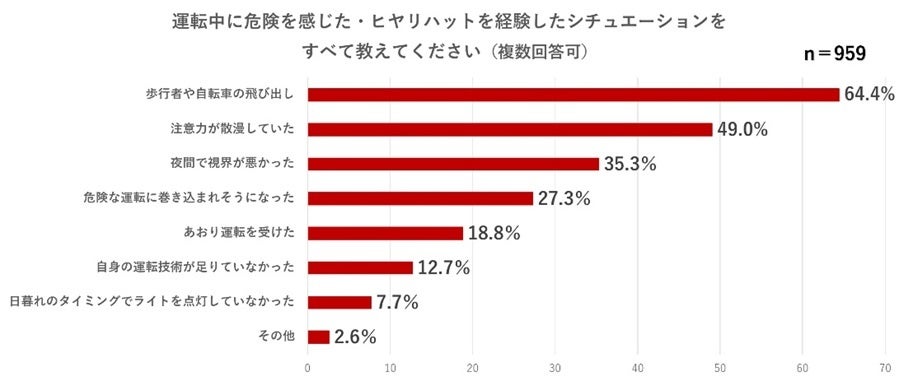 ヒヤリハットについての質問では、95.9%が「ヒヤリハットを経験したことがある」と回答。ヒヤリハットが発生したシチュエーションについて最も多かったのは「歩行者や自転車の飛び出し」(64.4%)、次いで「注意力の散漫」(49.0%)、「夜間で視界が悪かった」(35.3%)という結果になりました。
