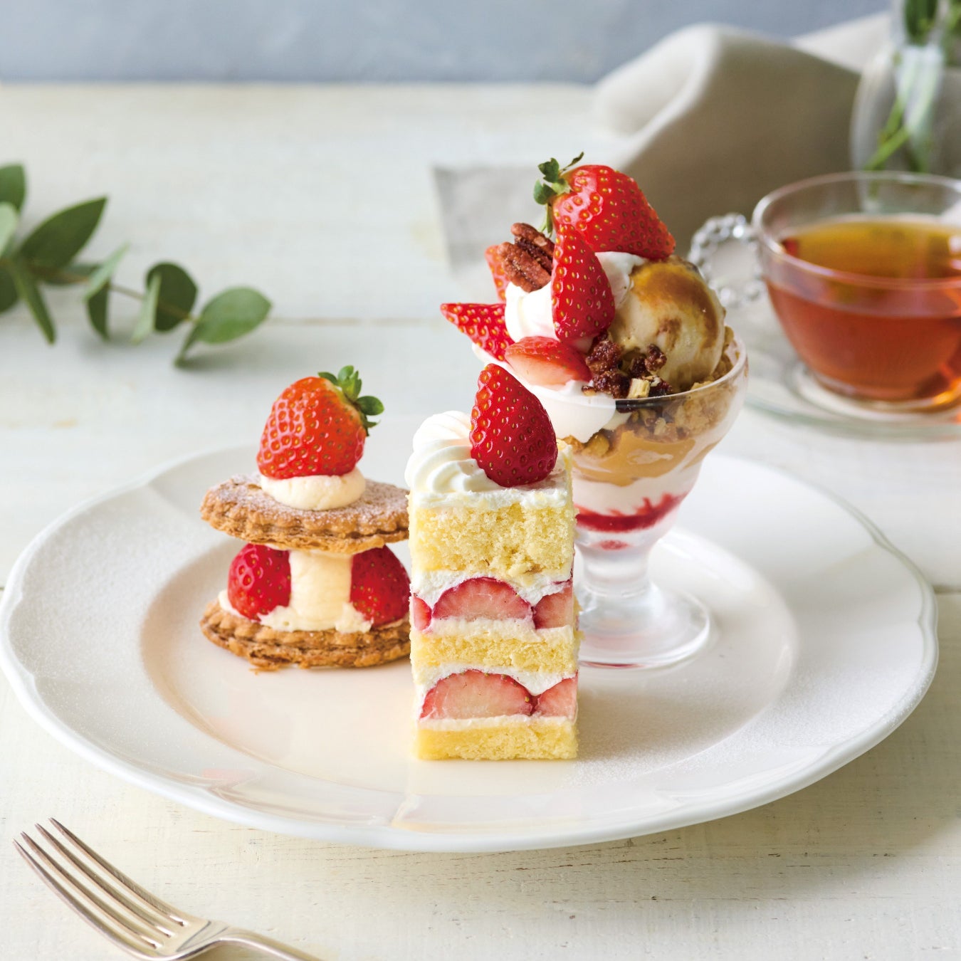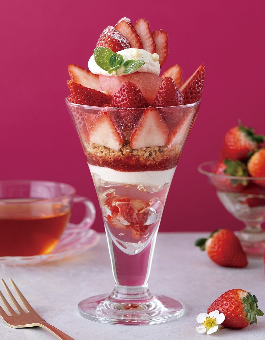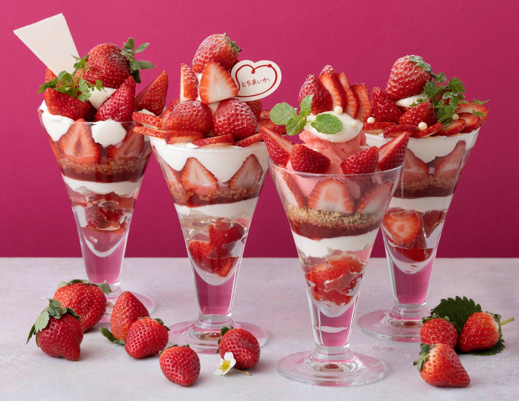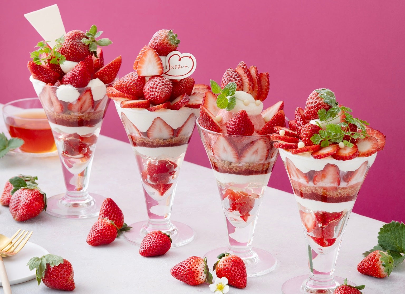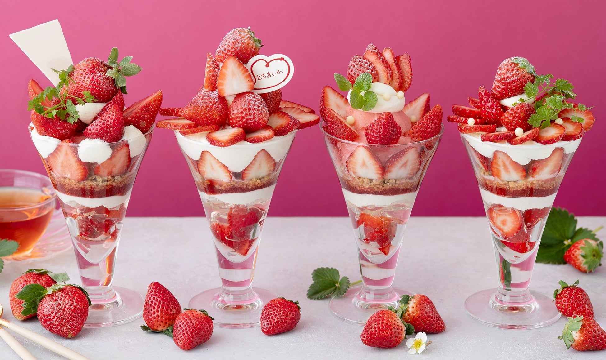 そのほか、店舗限定で登場するのは、酸味が少なく甘さが際立つ「とちあいか」、甘みと酸味のバランスがよい「あまおう」、つやのある鮮やかな紅色で甘味が強く甘酸っぱい「紅ほっぺ」の3種の苺を贅沢に使用した店舗限定パフェも登場します。