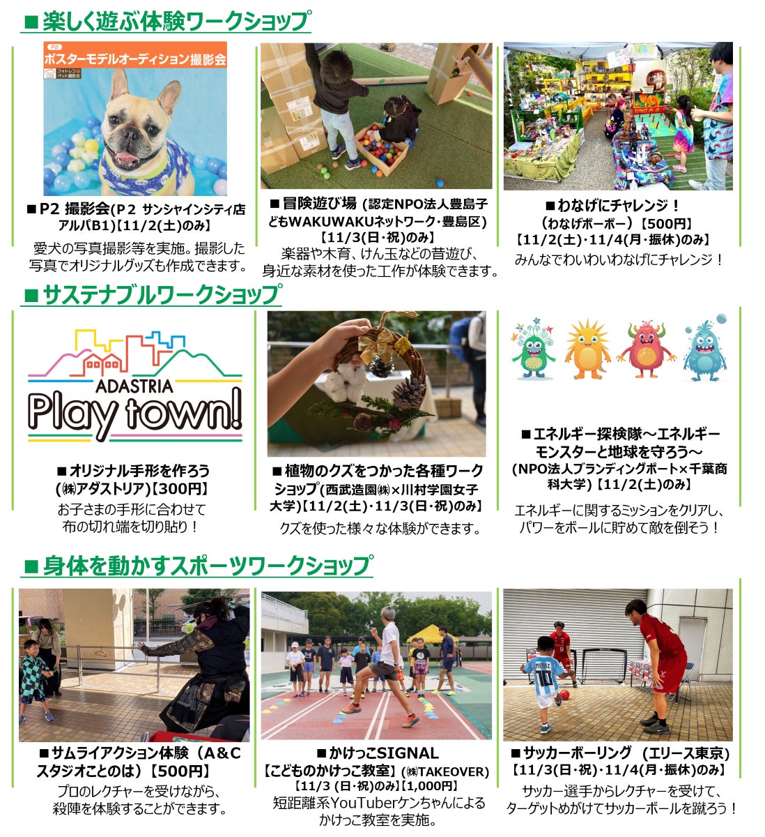 本プレーパークは、池袋東口エリアを中心に、リビングのように居心地の良いまちなかを目指すプロジェクト「IKEBUKURO LIVING LOOP(イケブクロリビングループ)※」のサブ会場として、本年5月・7月・9月の第1土曜日に開催してきました。当日は子どもの遊び場として、スポーツコンテンツやサステナブルなワークショップなど、遊びながら学ぶことができる合計25コンテンツを展開。ウォーカブルなまちづくりを推進している豊島区とともに東池袋エリアの活性化と回遊性向上を目指します。