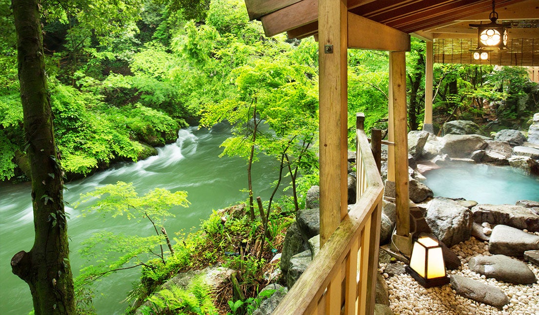 北陸随一の景勝地と名高い「鶴仙渓」に架かる「こおろぎ橋」からすぐ、全室リバービューの加賀モダンな湯宿。露天風呂や貸切風呂、ロビーラウンジ、客室から鶴仙渓の新緑、深緑、紅葉、雪景色など、四季折々の情景をご覧いただけます。