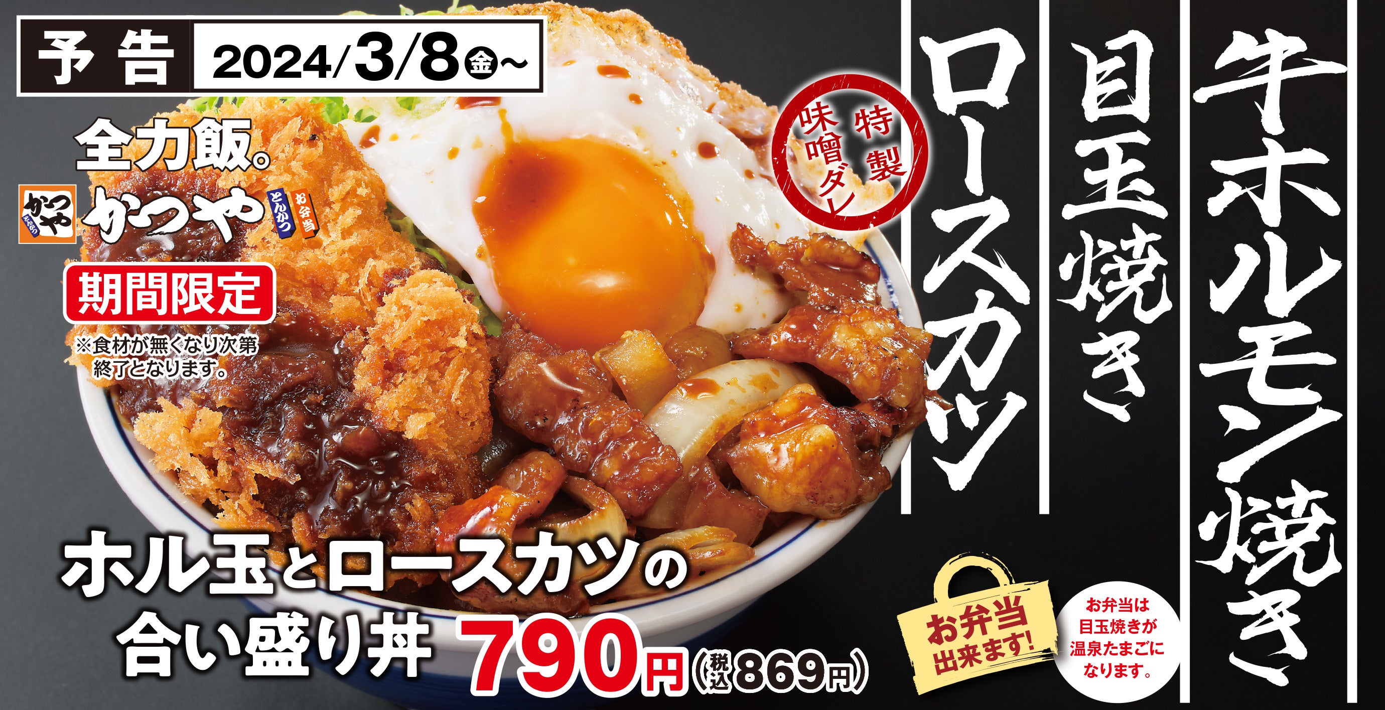 とんかつ専門店「かつや」といえばロースカツ。正統派、期間限定メニューとして2024年3月8日(金)より販売を開始する「ホル玉とロースカツの合い盛り」は、丼と定食の2種類をご用意いたしました。