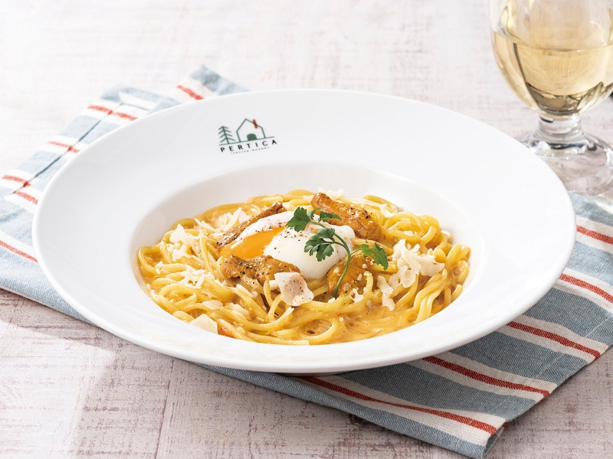 「うに」の磯の味わいと旨味、そして「カルボナーラ」の濃厚なクリーム感が融合した贅沢な一品。トッピングの温泉玉子でまろやかさをプラスしながら味わいの変化をお楽しみください。