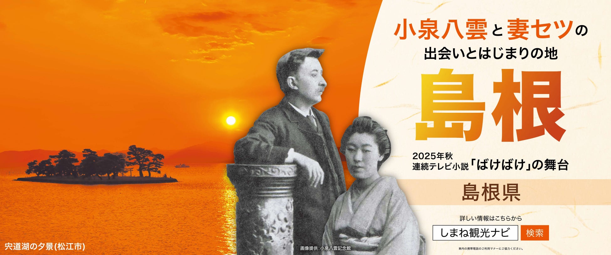 島根県観光振興課では、 2025 年秋から放送予定の連続テレビ小説「ばけばけ」 をきっかけとして、 首都圏と関西圏の皆様にドラマのモデルである小泉八雲 ・ セツ 夫妻 と 、夫妻が巡った島根の思い出の地を広くPRするため、東京メトロ半蔵門線と大阪モノレールの車内にポスターを掲出しました。