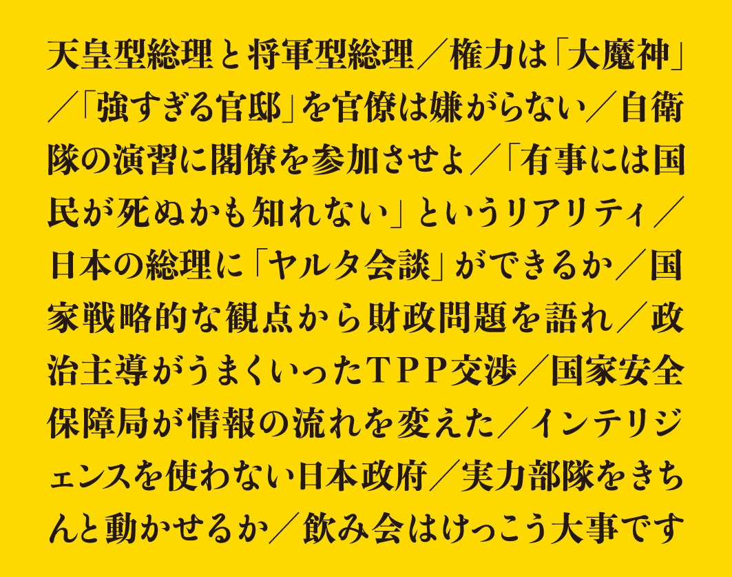 総理大臣には働いてもらわなければならない。それも最初から、全力で。しかし、巨大タンカーのごとき日本政府を操るにはコツが必要だ。政治家の意志で、霞ヶ関は動かせるのか。そして「本物の有事」に直面した時、政治は自衛隊などの実力部隊をコントロールできるのか。歴代最長の安倍政権で内政・外政・危機管理の各実務トップを務めた官邸官僚が参集し、適切な権力行使のための「官邸のトリセツ」を公開する。