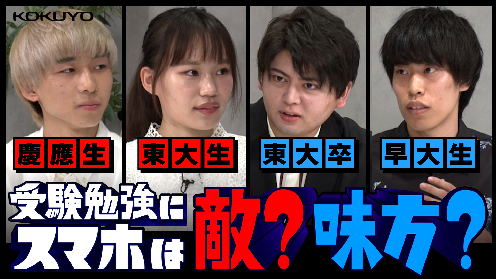 受験勉強において、スマホやSNSは「誘惑してくるから勉強中は使わない敵」か、それとも「アプリなどを駆使して勉強する味方」かを、動画内では、「学力アップ」「タイパ(タイムパフォーマンス)」「モチベーション」の3つのテーマに沿って討論。東大合格者でインフルエンサーの砂川信哉さんと岡本沙紀さんのお2人と、一般受験を経験し、難関大学に合格した現役大学生お2人が、それぞれのチームに分かれて討論します。