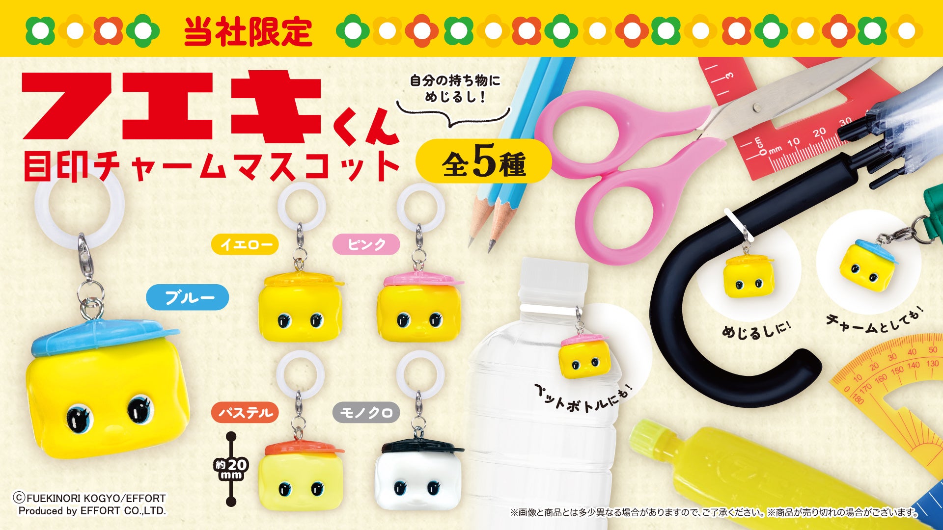 不易糊工業の「どうぶつのり」のキャラクター、赤い帽子に、黄色いお顔の「フエキくん」がチャームマスコットになってかぷえぼに登場。通常は赤×黄のフエキくんが、「ブルー」、「イエロー」、「ピンク」、「パステル」、「モノクロ」の当社限定5種類のカラーバリエーションになった「フエキくん目印チャームマスコット」を展開いたします。