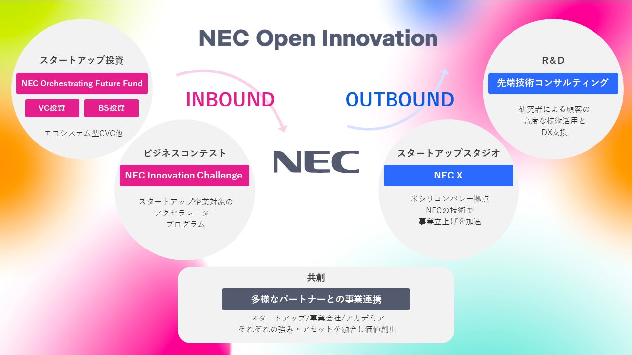 外部の技術やアイデアを導入する「インバウンド型」と、自社の技術や知見を外部に提供し、事業開発を加速する「アウトバウンド型」の2軸で展開する、NEC独自のオープンイノベーションのモデルについて紹介しました。