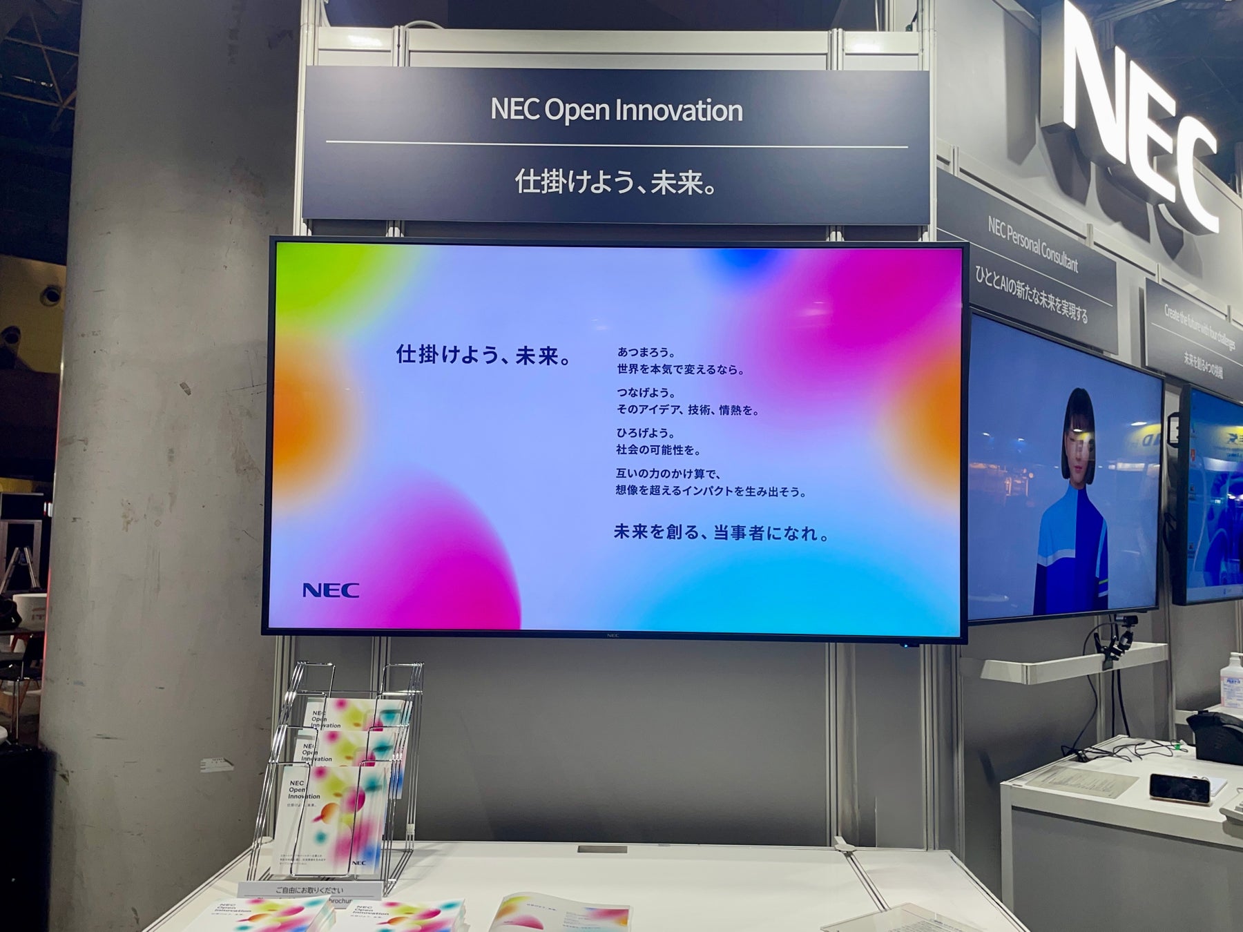 NECブースでは、「仕掛けよう、未来。」をキーメッセージに、2025年2月に発表した「NEC Open Innovation」の全体像を展示。
