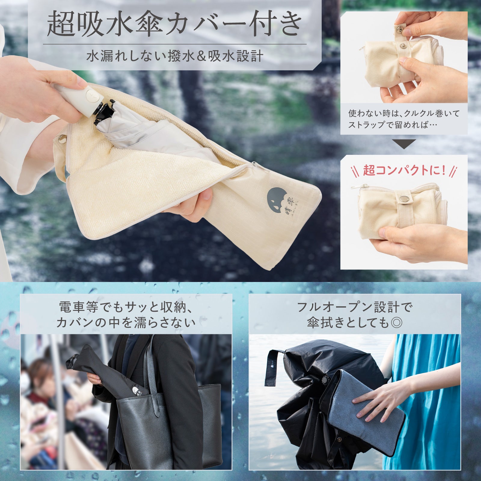 日傘と雨傘を持ち替えない“1本で完結”という発想のもと、完全遮光・UVカット100%・126g〜の軽量設計に加え、濡れた傘をそのまま収納できる吸水カバーを採用。移動中はカバンを濡らさず、帰宅後はカバーをタオルのように使って水滴を拭き取り、そのまま乾燥させることが可能です。