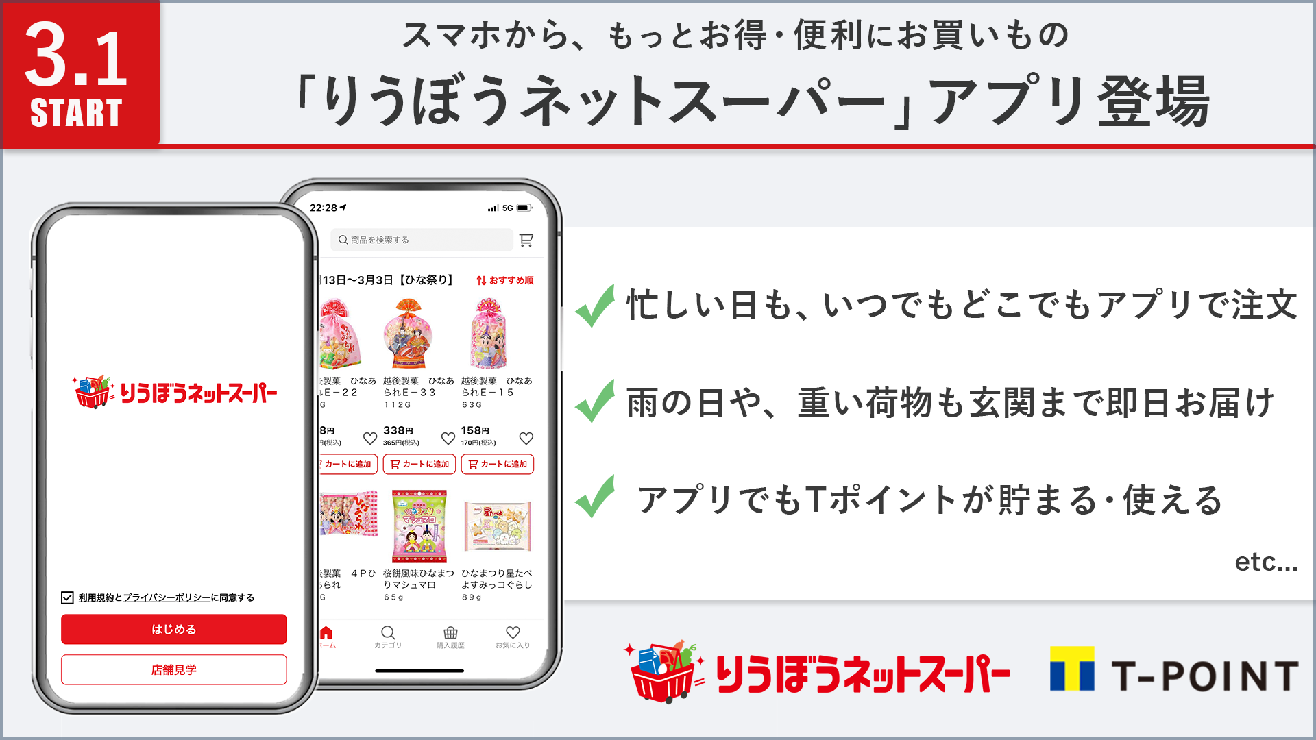 沖縄県内のスーパーマーケット「リウボウストア」を運営する株式会社リウボウストア(本社:沖縄県那覇市、代表取締役社長:糸数剛一)と、CCCMKホールディングス株式会社(本社:東京都渋谷区、代表取締役社長 兼 CEO:髙橋誉則)は、スマートフォンからも「りうぼうネットスーパー」を利用できるアプリ(App Store:https://apps.apple.com/jp/app/りうぼうネットスーパー/id6443805791 /Google Play:https://play.google.com/store/apps/details?id=tv.every.fresh.ryubostore)をローンチし、同アプリ上でもTポイントが貯まる・使えるサービスの提供を開始いたします。