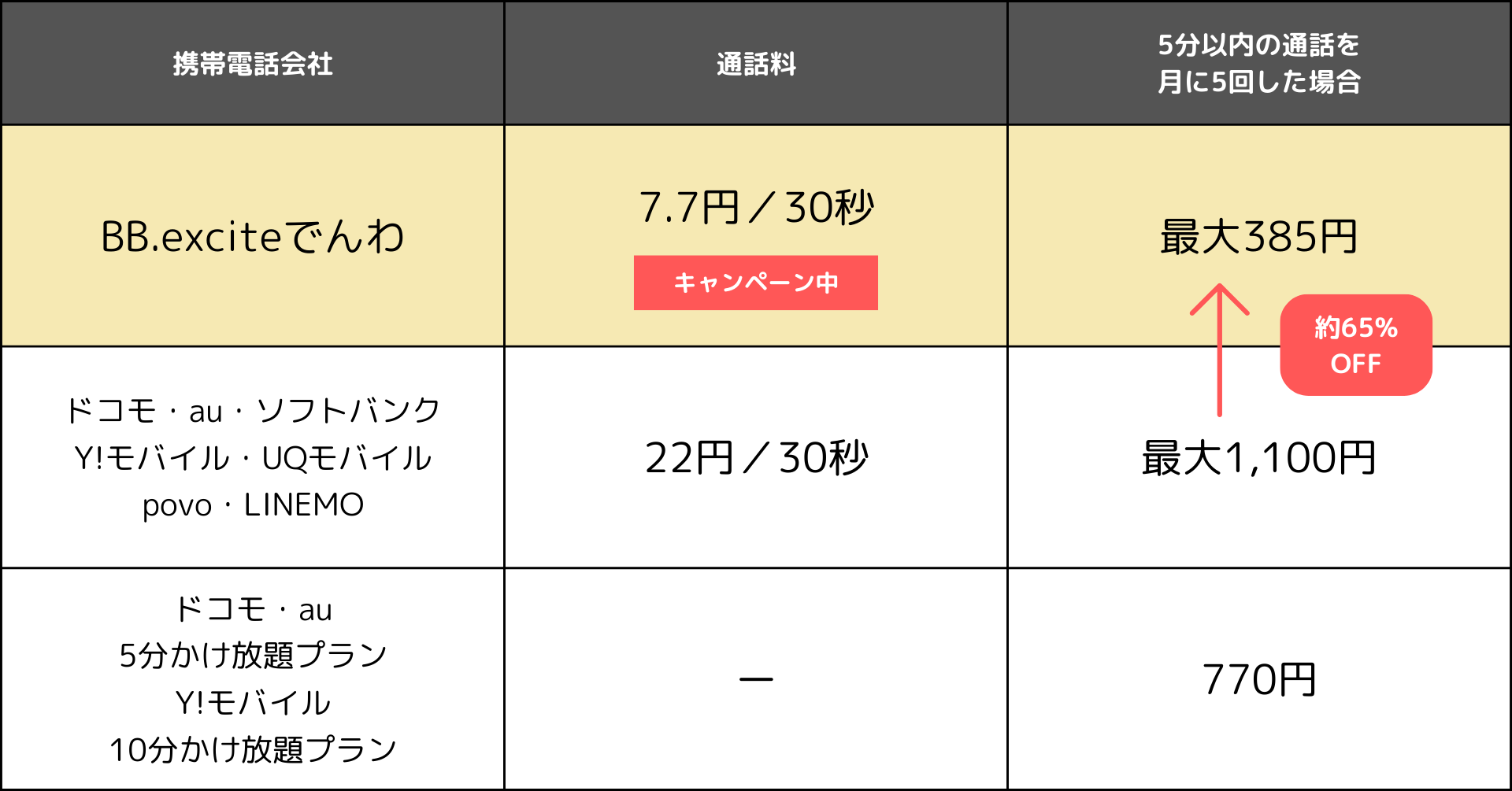 大手携帯電話会社の通話料は22円/30秒(税込)。BB.exciteでんわを使えば半額の11円/30秒(税込)で通話いただけます。しかも、今ならキャンペーン(※1)で7.7円/30秒(税込)で使えます。