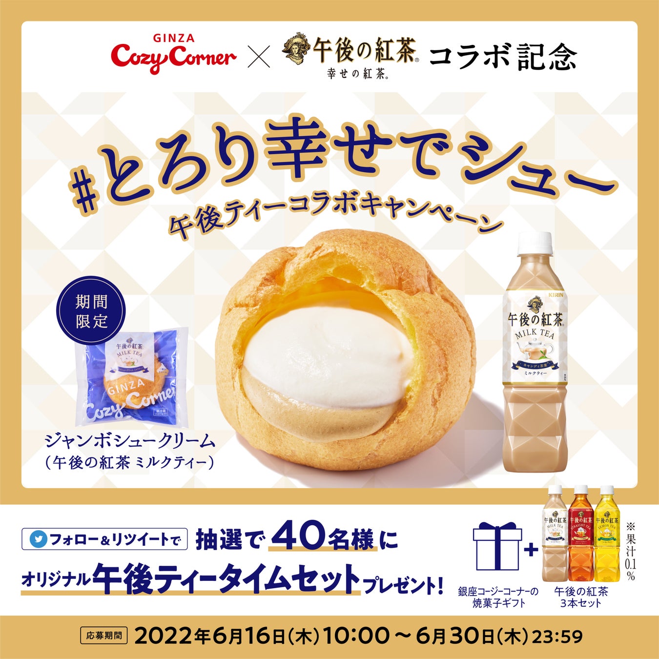 そんなコラボスイーツの発売を記念し、6月16日(木)より「#とろり幸せでシュー 午後ティーコラボキャンペーン」を開催。抽選で40名様に「オリジナル午後ティータイムセット」をプレゼントします。