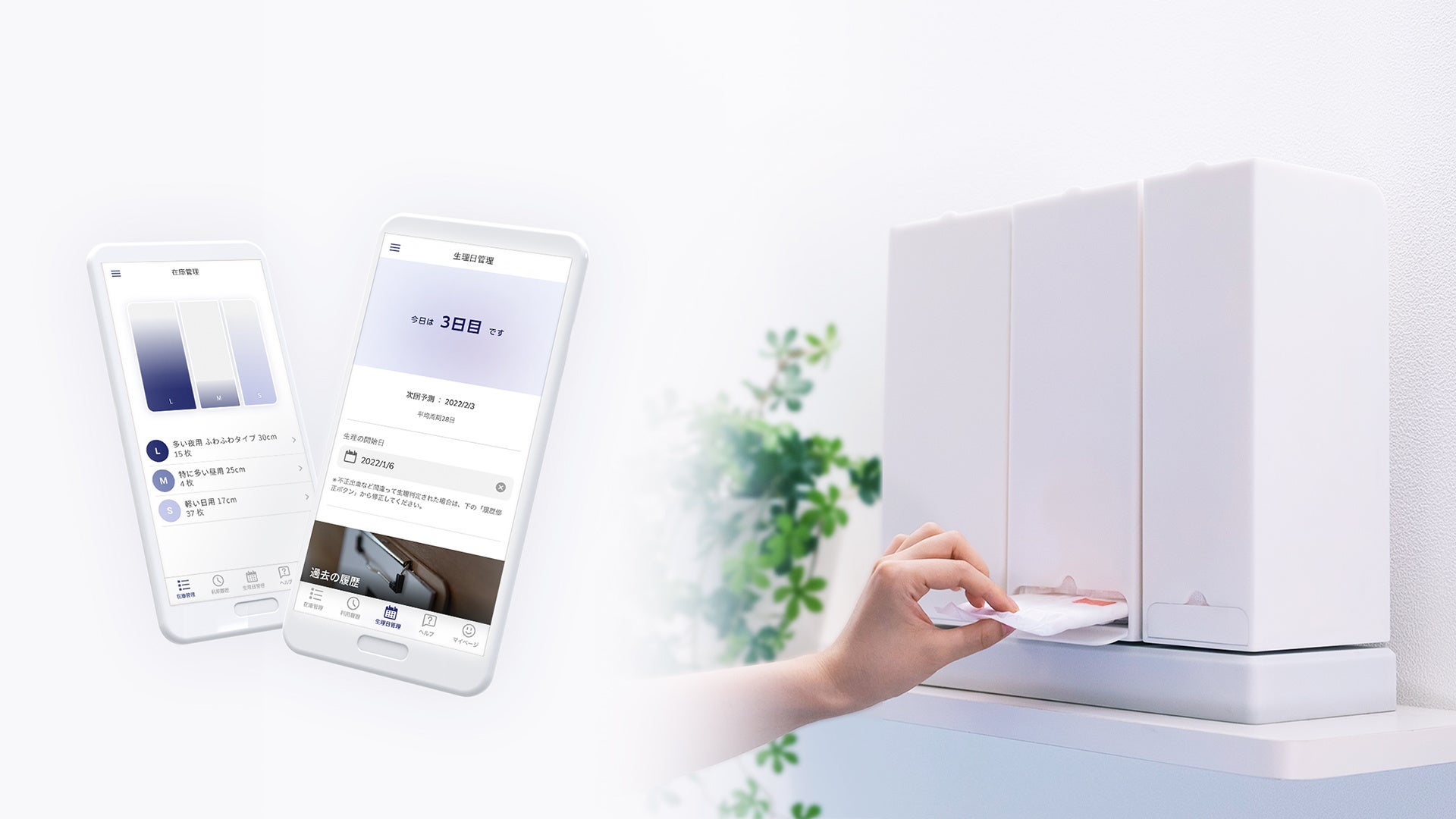 今回展示スタートする「生理用品IoT収納ケース」は、生理用品をサイズ別に収納し定期的に使用状況をセンシングすることで、買い物時などにスマートフォンアプリで残量を確認できます。使用状況の分析によって、いつもと同じように生理用品を使うだけで周期を自動的に記録していきます。女性の月経にまつわるストレスの軽減と安心して継続的に利用できるヘルスケアサービスの実現を目指しています。なお本サービスは経済産業省の「フェムテック等サポートサービス実証事業費補助金」の採択事業にも選ばれています。