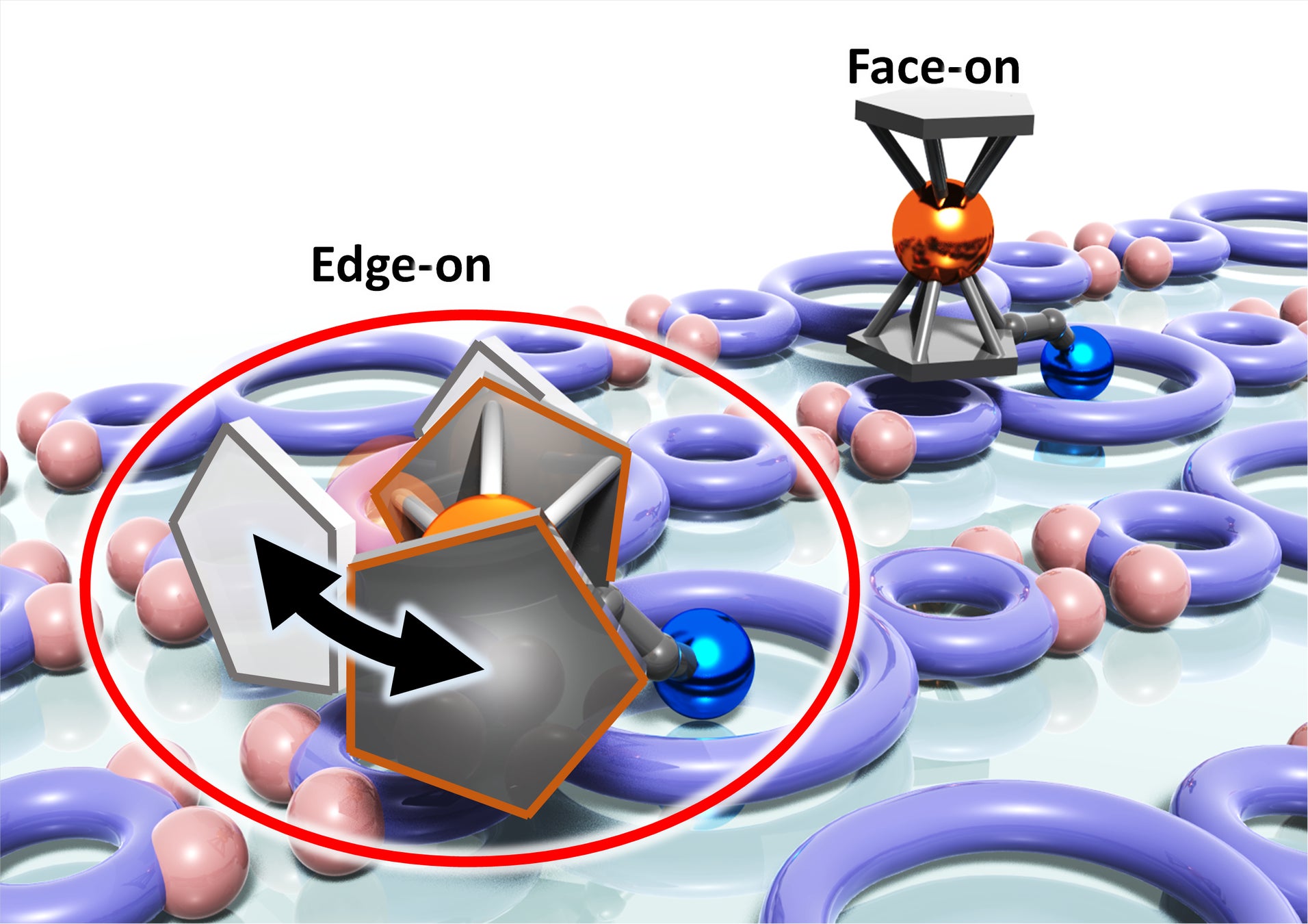次に、このフェロセン分子の上にSTM探針を設置し、電圧-1.3 Vを印加しました。すると、探針から正孔(ホール)がフェロセン分子の分子空準位に入り、Fe2+からFe3+に変わりました。これによりフェロセン分子の五員環が車のタイヤのように回転することで、フェロセン分子が横方向に移動することがわかりました。図2のようにFace-onとEdge-onの二種類がありますが、横倒しのEdge-onのみが横方向移動しました。電圧により構造変化の動画もご覧ください(以下URL参照)。