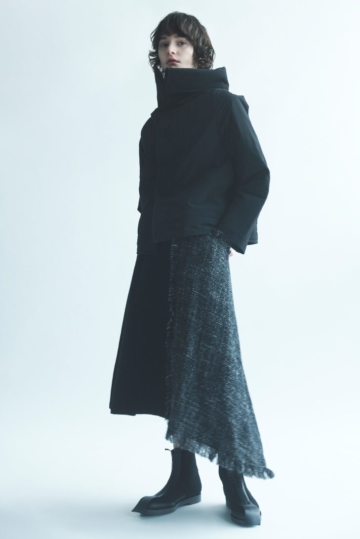 POP-UP STOREでは、ショーピースから着想を得た、白と黒のコントラストが際立つツイード素材のセットアップや、キルティング加工により温もりと柔らかさを兼ね備えたコートなどを展開いたします。