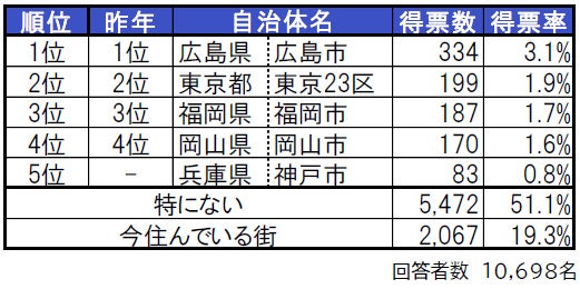 住みたい街1位は、4年連続で広島県広島市。2位と3位は2年連続で東京23区と福岡県福岡市。