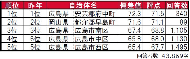2位と3位は2年連続で、岡山県都窪郡早島町と広島県広島市南区。