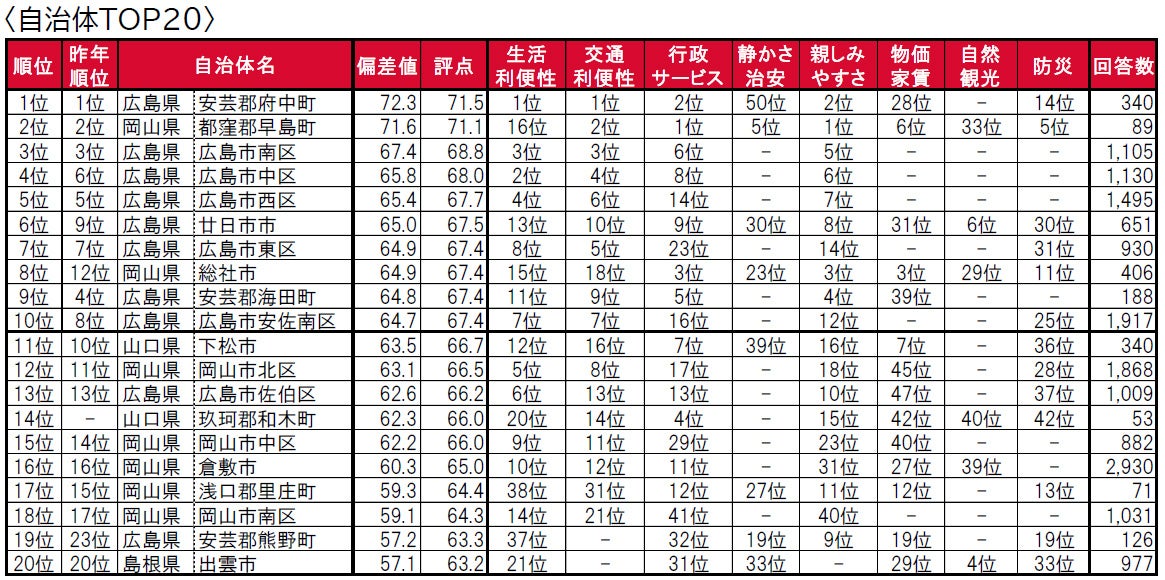 14位には、昨年はランキング集計対象外だった山口県玖珂郡和木町が新たにランクインしています。また、19位には広島県安芸郡熊野町が昨年23位から順位を上げてトップ20入りしています。