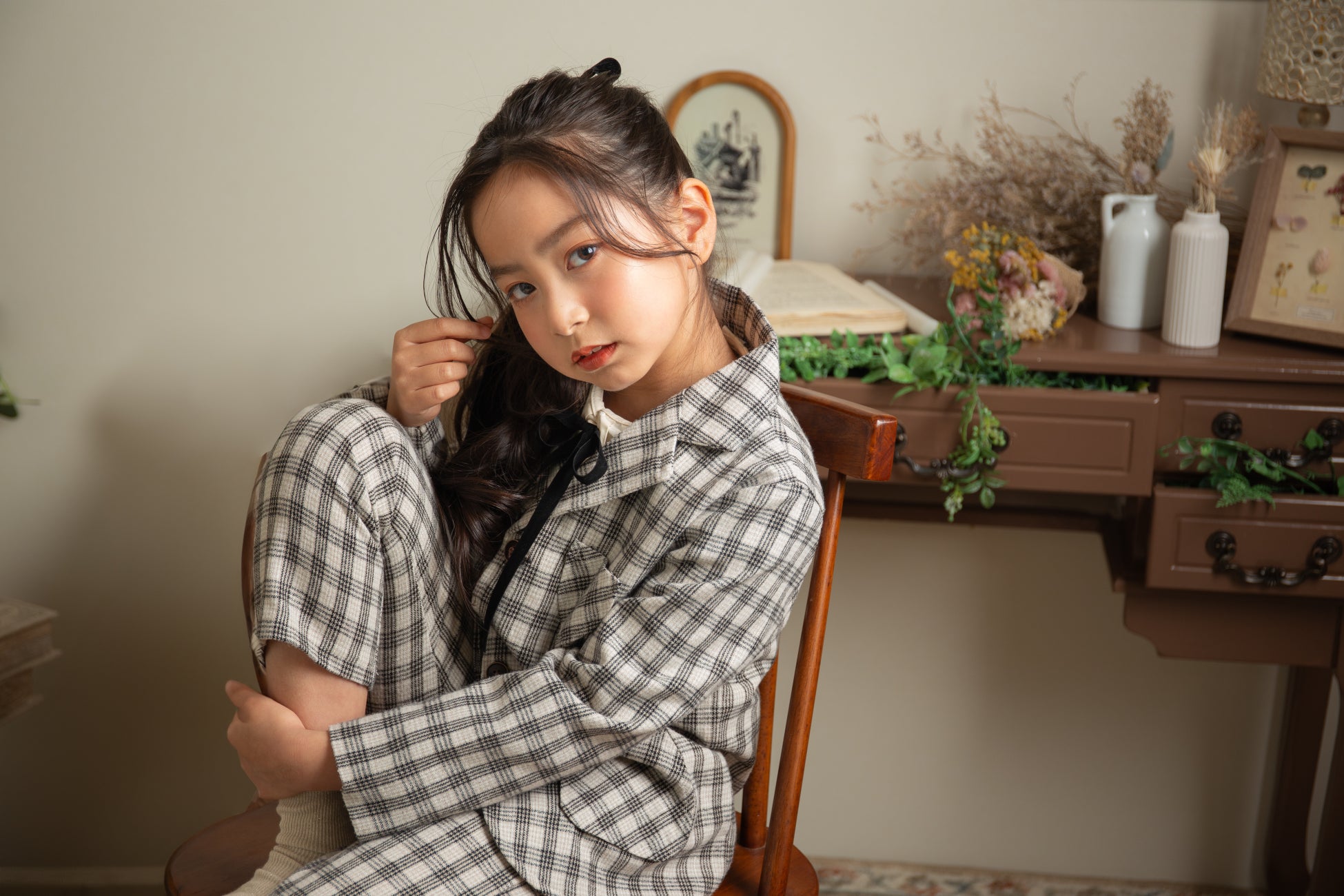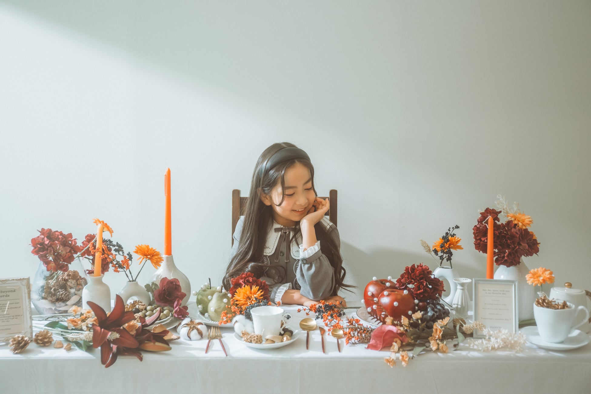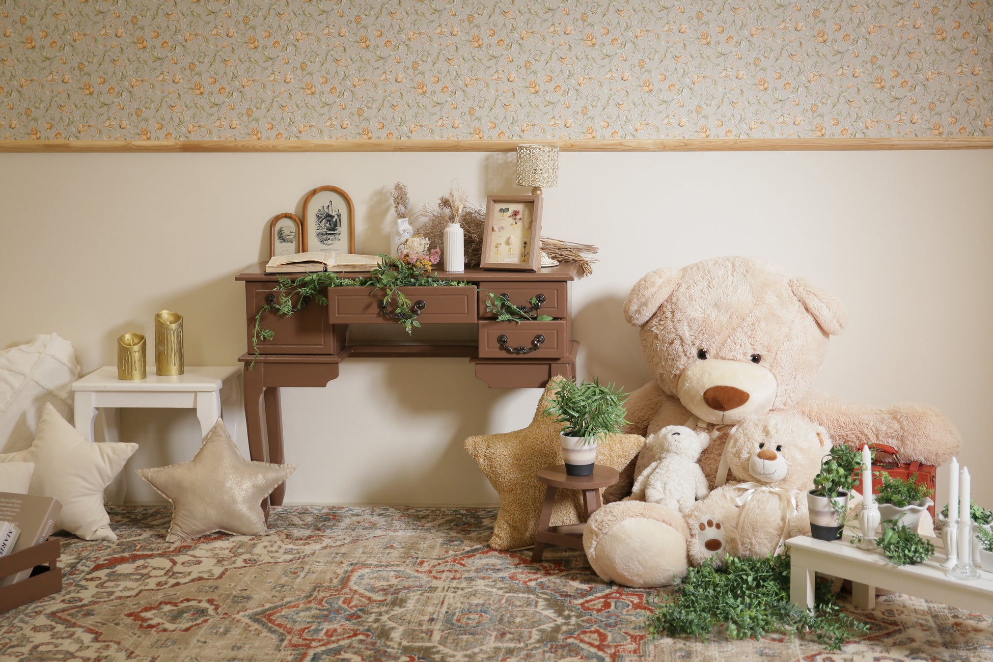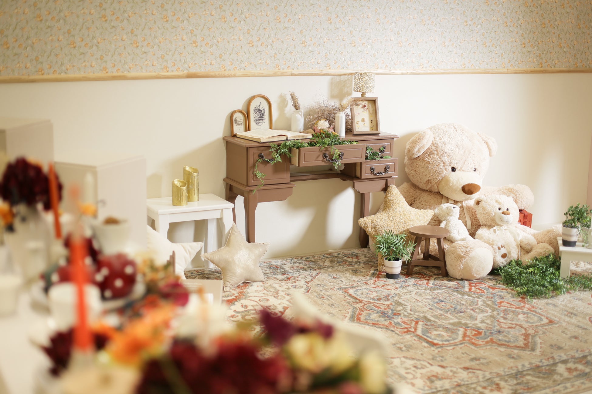 アンティーク調の壁紙や小物の中に、中でも一際雰囲気漂うシンプルでボタニカルな空間。ブラウンの衣装やキャメル色のランドセルでくまのぬいぐるみとのリンクコーデもおすすめ。