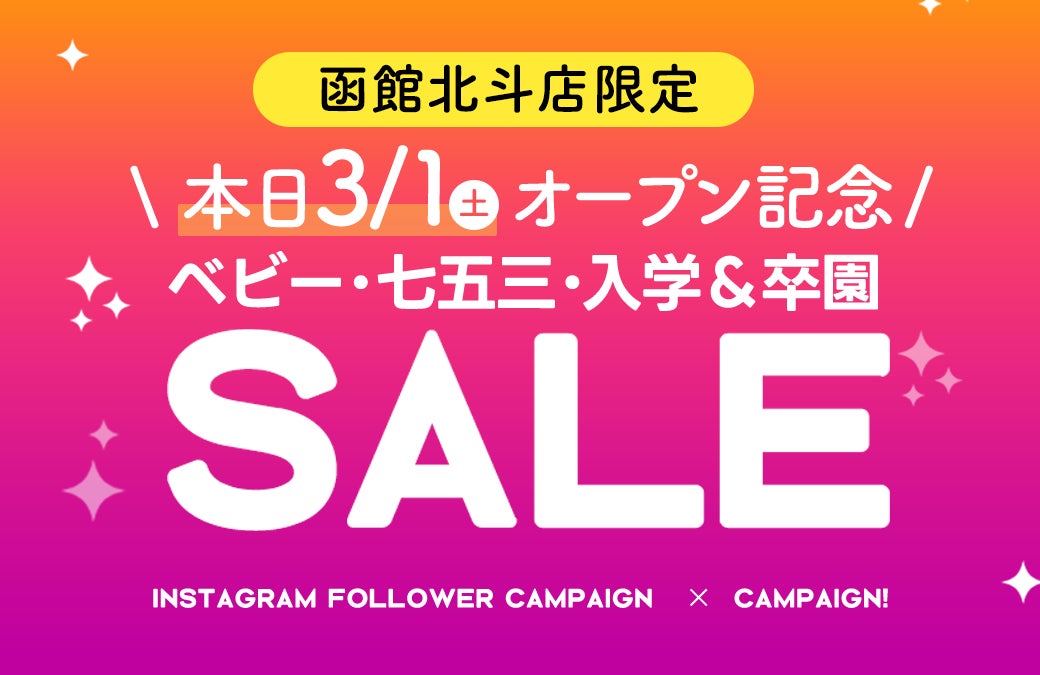 3月10日(月)までのオープン記念ベビーキッズ全種目セールを開催中。