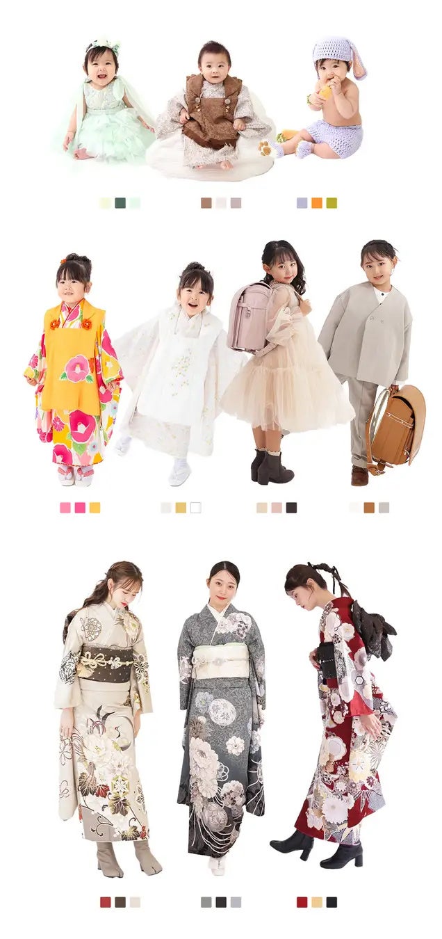 色とりどりの背景でベビーキッズ撮影から成人撮影まで、和装や洋装まで、どんなシチュエーションにも合ったご撮影が可能となっております。