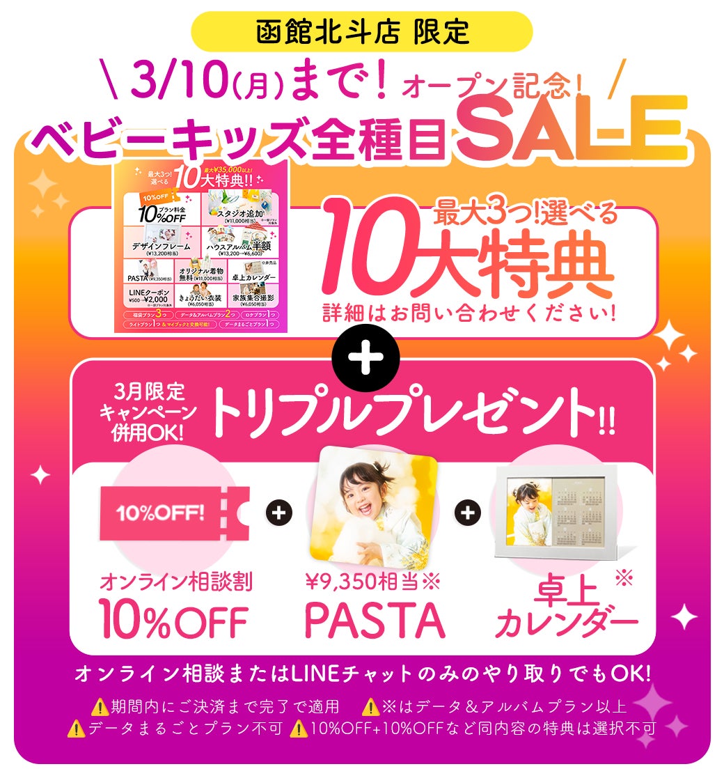 多くの人に愛された函館店が函館北斗店へ統合し、リニューアルスタジオと多彩なバリエーションある撮影で、函館のお客様に特別な体験をお届けします。