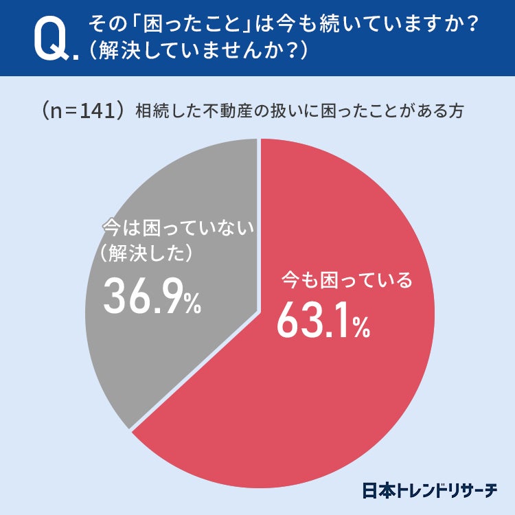 27%が「相続した不動産の扱いに困ったことがある」と回答しており、そのなかで63.1%の方が「困ったこと」は今も続いている(解決していない)と回答しています。