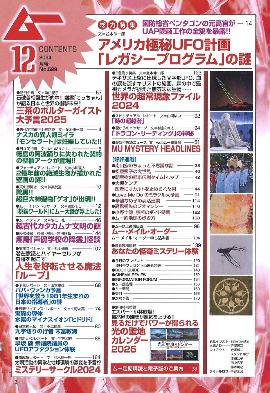 2色刷り特集 世界の超常現象2024/実用スペシャル 人生を好転させる魔法「ループ」/別冊スペシャル付録 見るだけでパワーが得られる光の聖地カレンダー2025/ババ・ヴァンガが予言 世界を救う1981年生まれの日本の指導者の謎/徳島の阿波踊りに失われた契約の聖櫃アークが登場‼/早坂敦 衆議院議員のUFOアブダクション事件/驚異の導体 水素のマイナスイオン「ヒドリド」/ナスカの異人類ミイラ「モンセラート」は妊娠していた‼/ほか