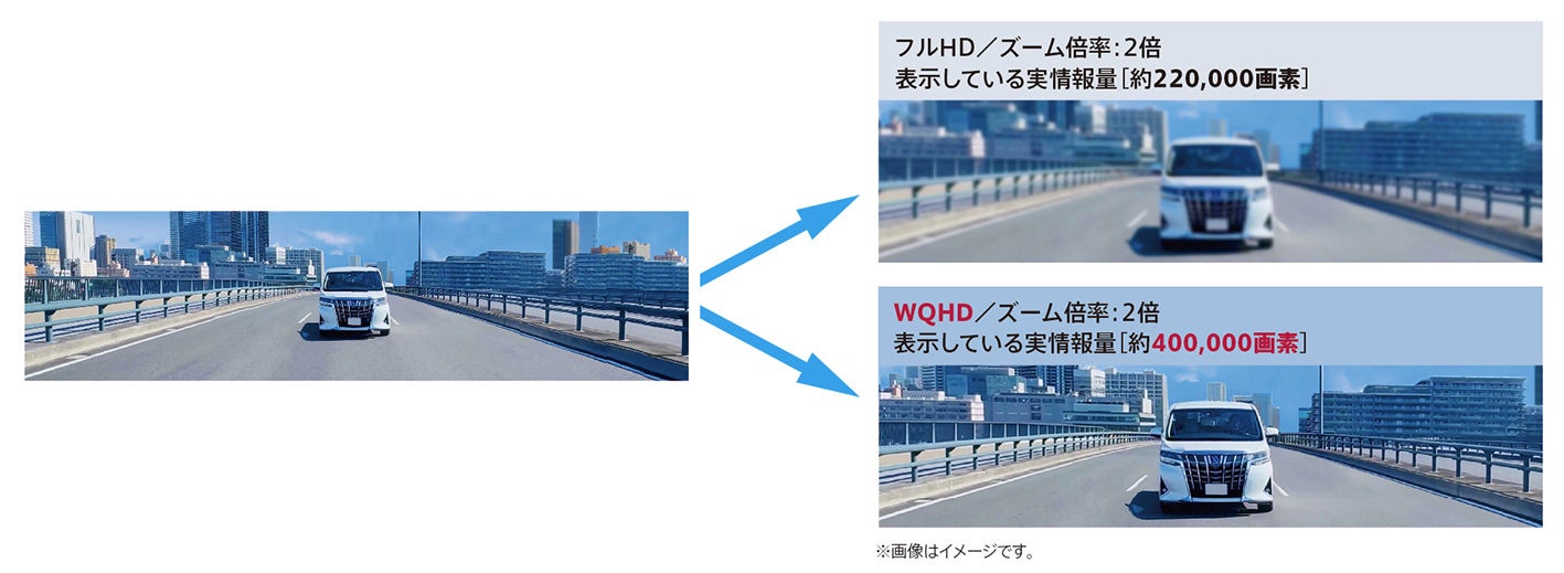 前後2カメラに搭載したWQHDカメラ(2560×1440)で、細部に至るまで高精細に録画できます。後方の画像をズームした際も、劣化の少ない自然な表示が可能です※1。