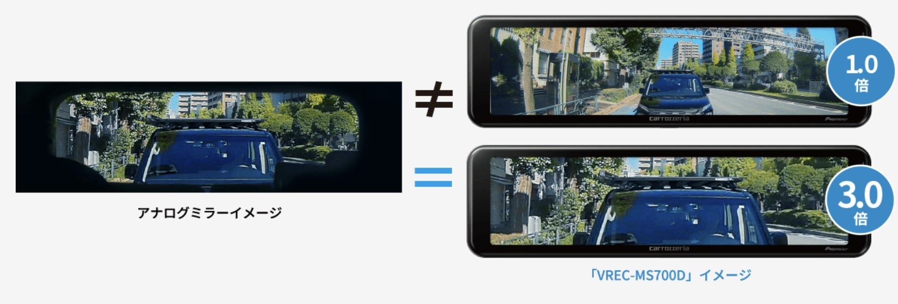 後方視界を幅広く表示するデジタルミラーは、アナログミラーと比較すると後続車両が小さく見えることがあります。「VREC-MS700D」は、ディスプレイの表示映像を1~3倍まで拡大表示できるので、好みや見やすさに合わせて設定できます。
