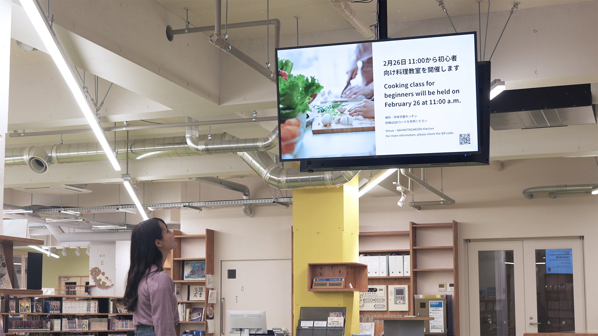 更に、シェアできる教室の扉横にタブレットを設置し、いつ・どのような内容で教室が利用されるのかを、児童・生徒、地域住民が知ることができます。学校内や役場などの人が集まる場所に設置されたサイネージにも、教室の活動情報が表示されるため、学校に集まるきっかけを作ります。