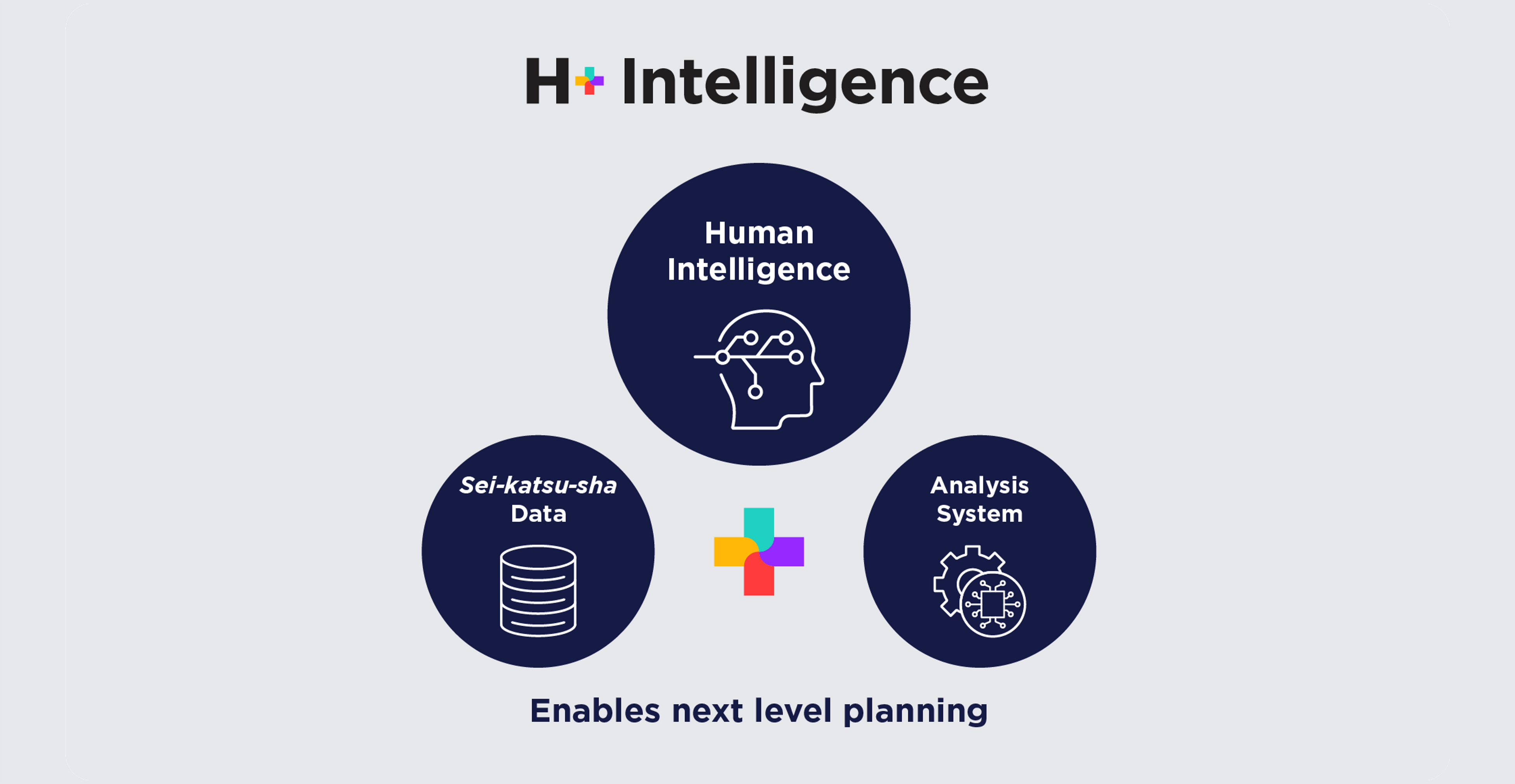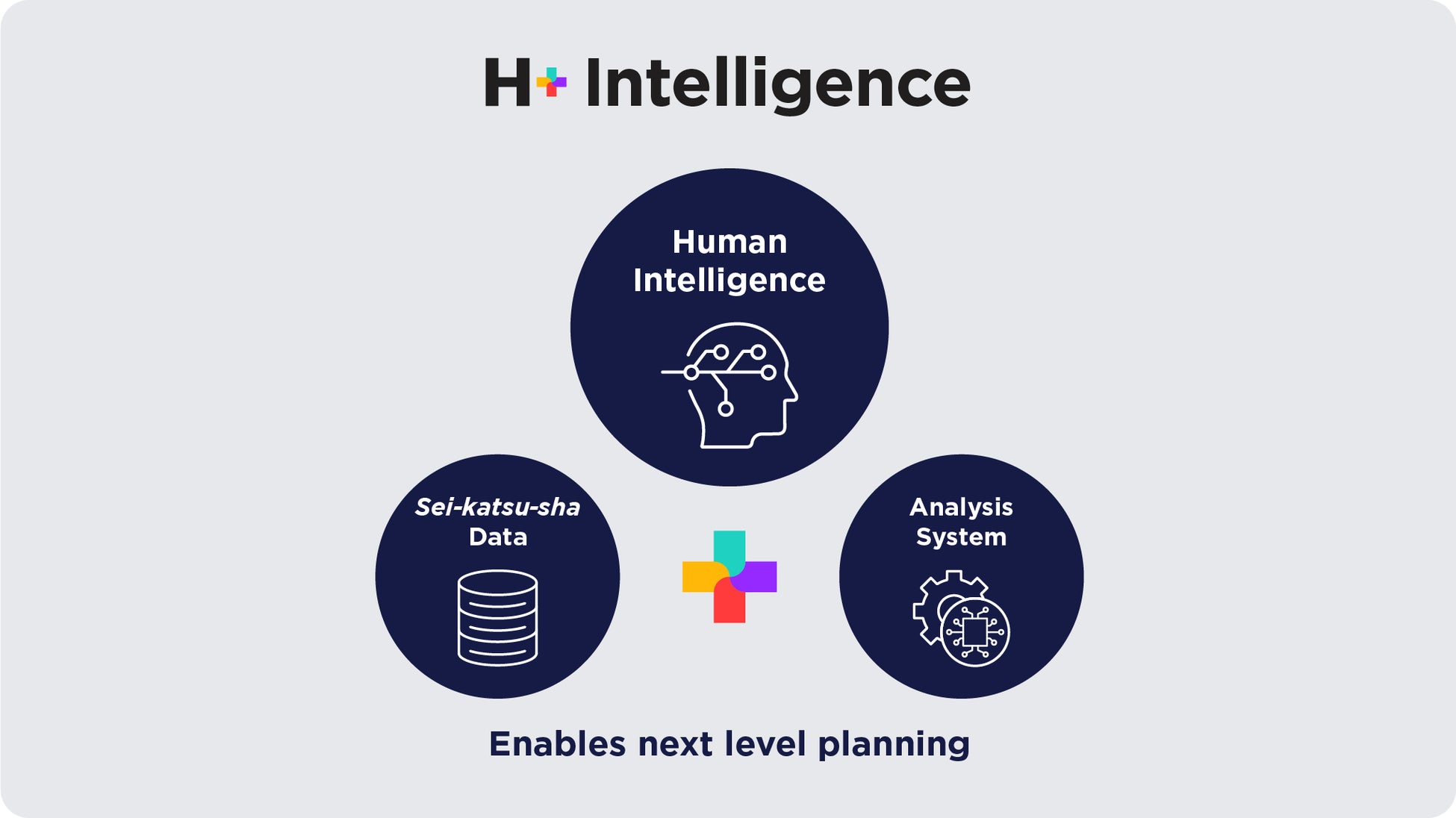 H+Intelligenceは、博報堂のフィロソフィーである「生活者発想」を基にしたプラニングをさらに高度なレベルで推進するための新たな仕組みと体制です。匿名化された多種多様な生活者データにアクセスできる環境と体制を整備し、AI(人工知能)搭載の分析基盤も活用して、生活者インサイトを描き出し、高度なプラニングを実現します。