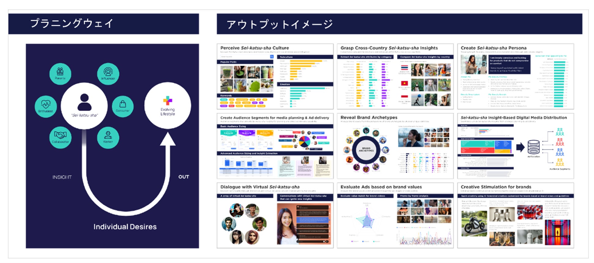 生活者に関わるデータの分析を、豊富な経験や知識を有するストラテジー人材の人的能力に加え、AI技術も駆使して行うことで、これまで以上に精緻に生活者インサイトや、その行動を明らかにできるようになりました。