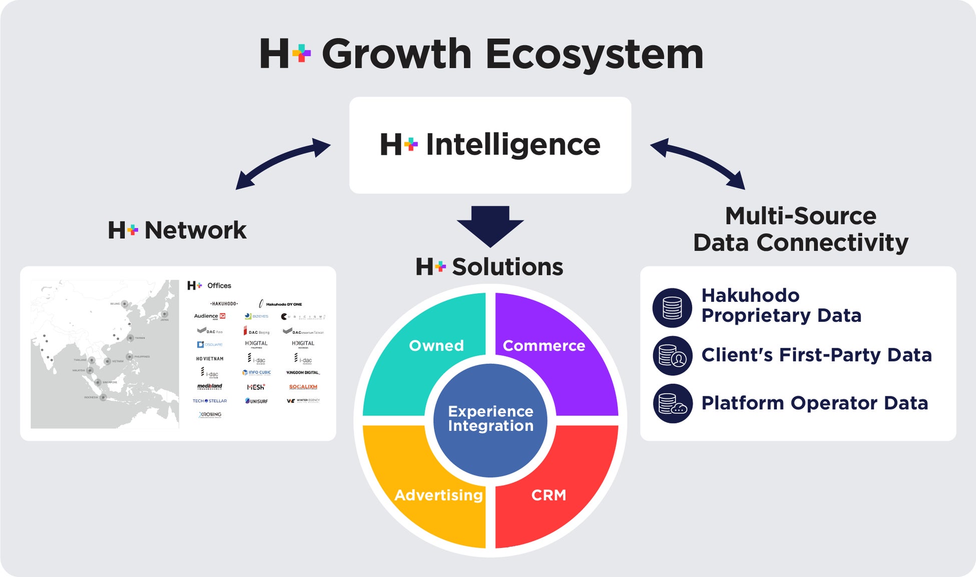 H+Intelligenceは、H+Growth Ecosystemの中核として機能し、目的に応じて博報堂が保有する独自データ、クライアント企業のファーストパーティデータ、そしてプラットフォーマーが保有するデータと組み合わせて生活者インサイトの分析を行います。博報堂DYグループのグローバルネットワークを活用しながら、H+が注力する4つの領域を中心に、企業のマーケティング活動の進化とビジネス成長を促進します。