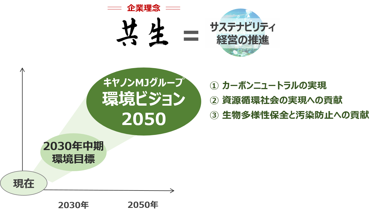 キヤノンMJは、キヤノングループが掲げる企業理念「共生」のもと、サステナビリティ経営を推進しています。持続可能な社会の実現に向け、「キヤノンMJグループ環境ビジョン2050」を策定し、3つの目標として①カーボンニュートラルの実現、②資源循環社会の実現への貢献、③生物多様性保全と汚染防止への貢献を掲げています。