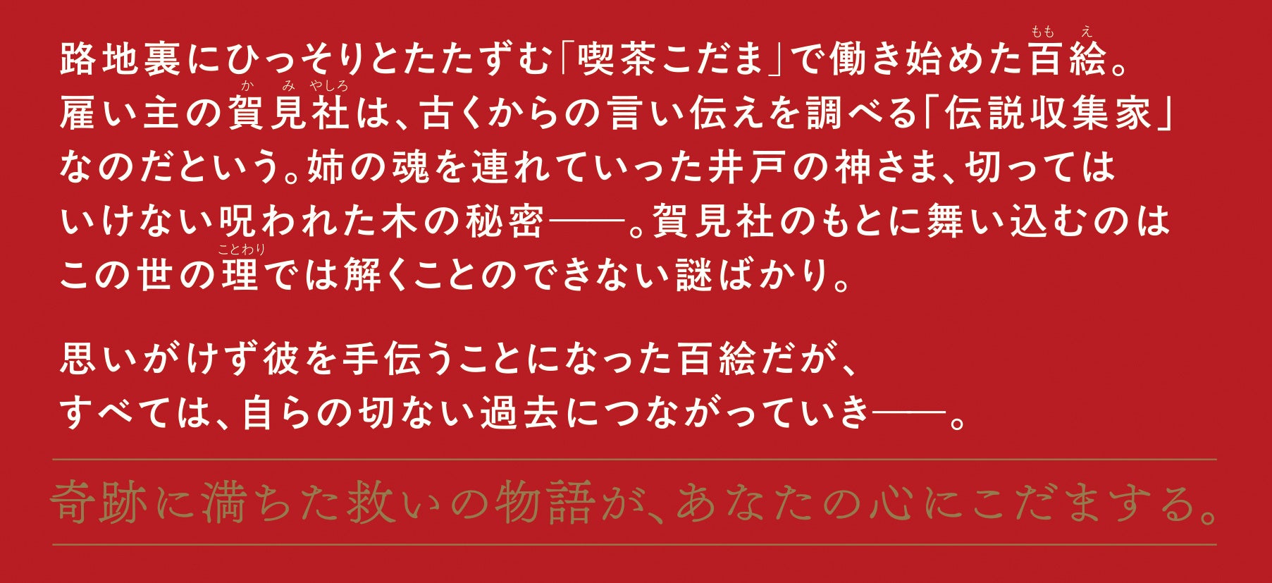 伝説収集家の賀見社と、現実的な感覚の百絵、二人のやりとりも読みどころです。