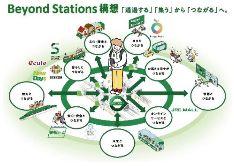 ヒトの生活における「豊かさ」を起点として、リアルの交流拠点である駅の強みを活かしながら駅空間の配置と機能を変革するとともに、JRE POINT生活圏の拡充を通じ、駅を「交通の拠点」から「暮らしのプラットフォーム」へと転換します。