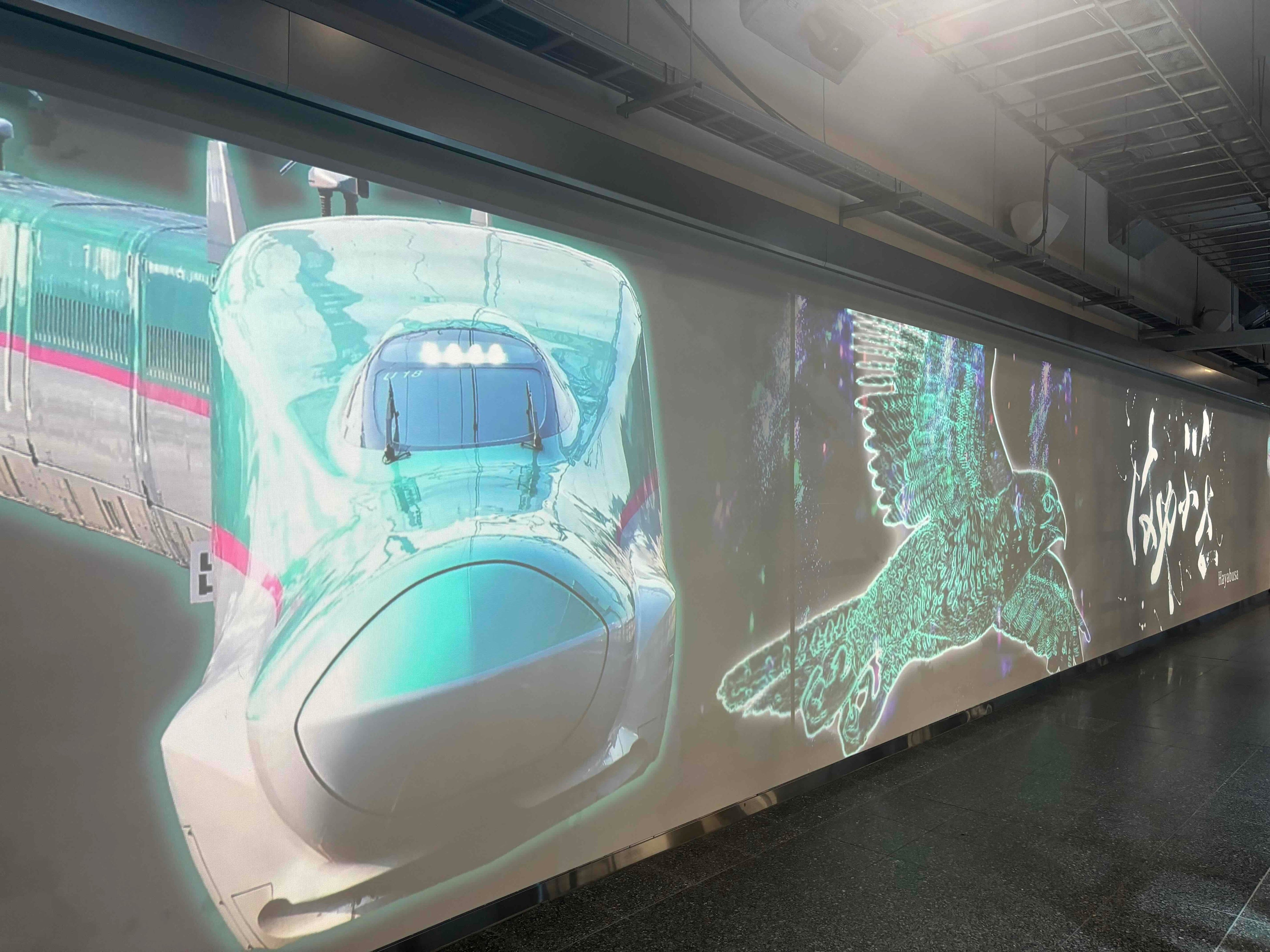 上野駅の歴史をたどるとともに、名列車の活躍した往年の姿を100mの壁面に投影し、現実に列車が進入・進出するかのようなダイナミックな演出と書道家が書き下ろした列車愛称の迫力ある書道アートが掛け合わさることで、懐かしさも感じさせる壮大なアートを体感いただけます。