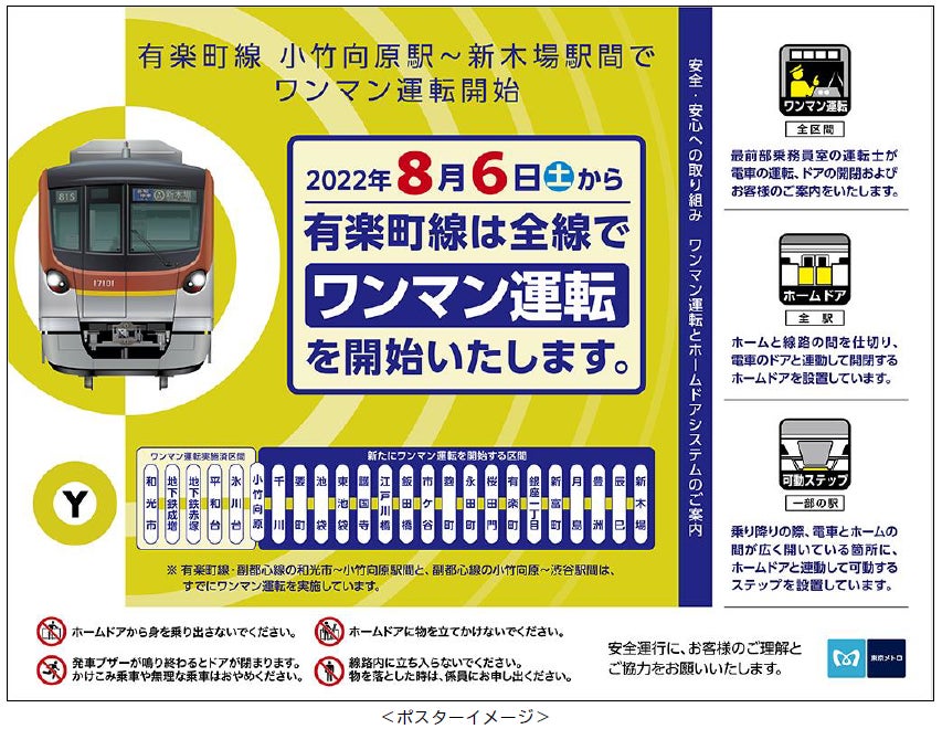 東京地下鉄株式会社(本社:東京都台東区、代表取締役社長:山村 明義、以下「東京メトロ」)では、2022年8月6日(土)から有楽町線小竹向原駅~新木場駅間において、ワンマン運転を開始します。