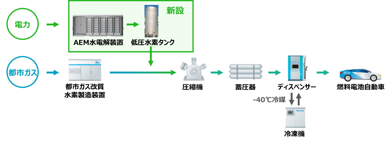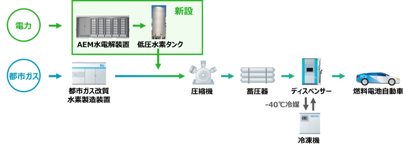 本ステーションは、2016年の営業開始以来、敷地内で都市ガスから製造した水素を販売してきました。昨年度末、非化石証書(*3)が付与された実質再生可能エネルギー100%の電気に切り替えを行うとともに、このたび、Enapter(エナプター)社製のAEM水電解装置を導入することで、CO2フリー水素の製造・販売を実現いたします。